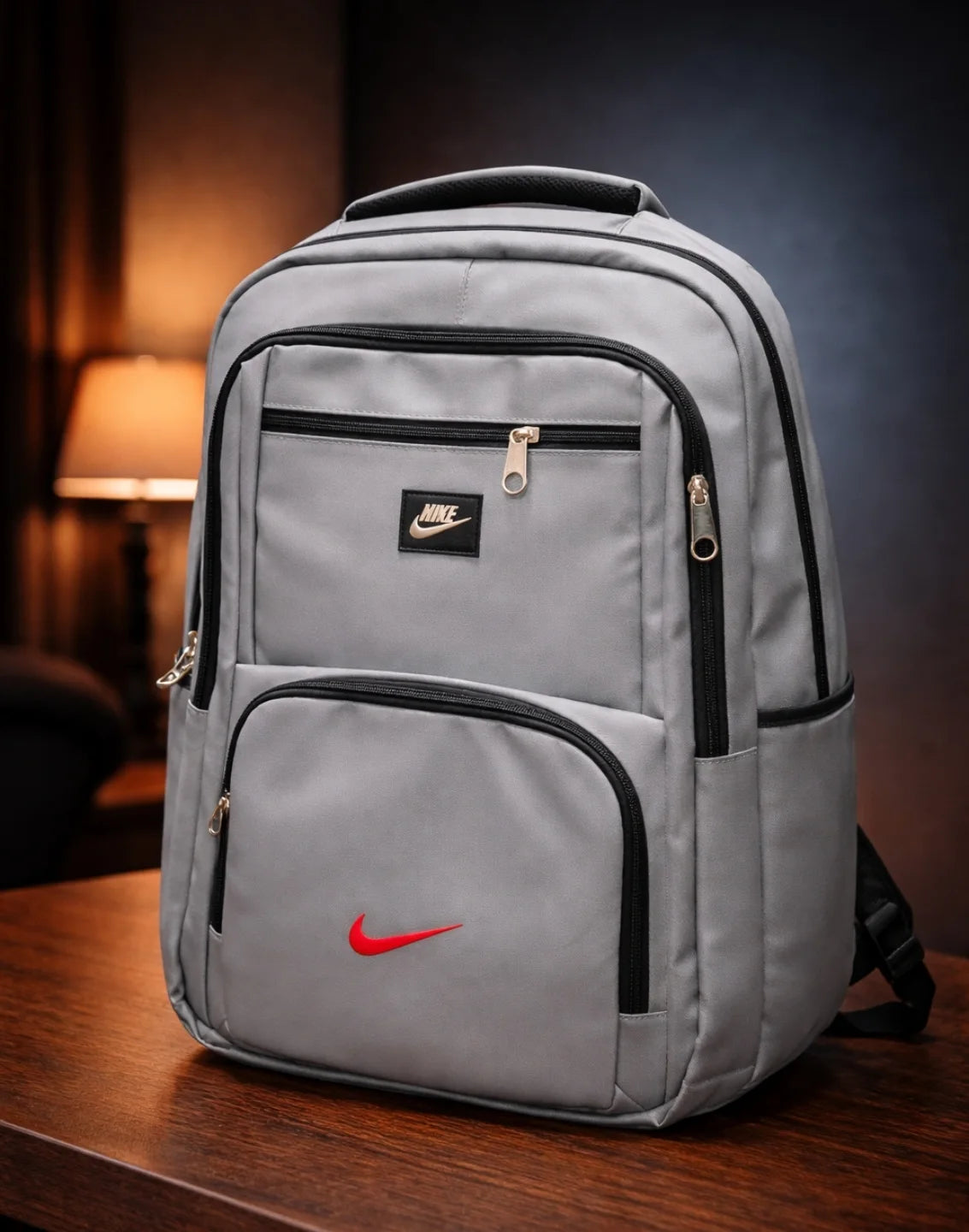 This sleek grey backpack features a clean and professional design, making it perfect for students and office use. It comes with multiple zip compartments for better organization. The smooth finish and structured shape give it a premium and modern look.
