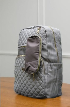 This stylish quilted backpack combines functionality with a modern, elegant design. Made from durable fabric with a sleek grey finish, it features a diamond-stitched front panel for a premium look. The spacious main compartment is complemented by multiple zippered pockets, allowing you to organize essentials with ease. Gold-tone zippers add a touch of sophistication, while the side pocket offers quick access for everyday items. Lightweight yet sturdy, this backpack is perfect for school, work, travel, or casual outings.
