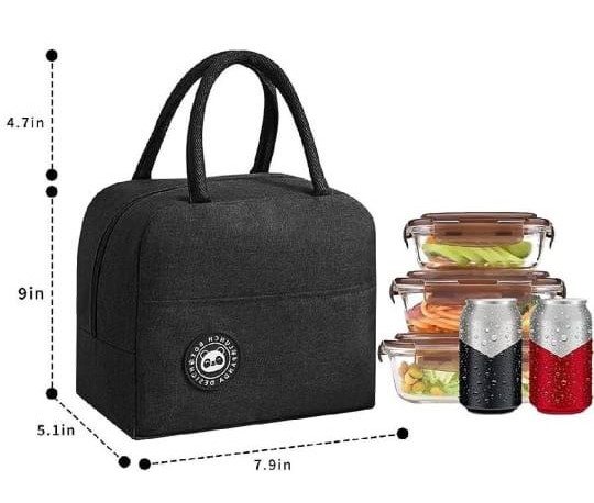 This is a black insulated lunch bag designed for carrying meals conveniently while keeping them fresh. The bag has a compact yet spacious design with the following dimensions: